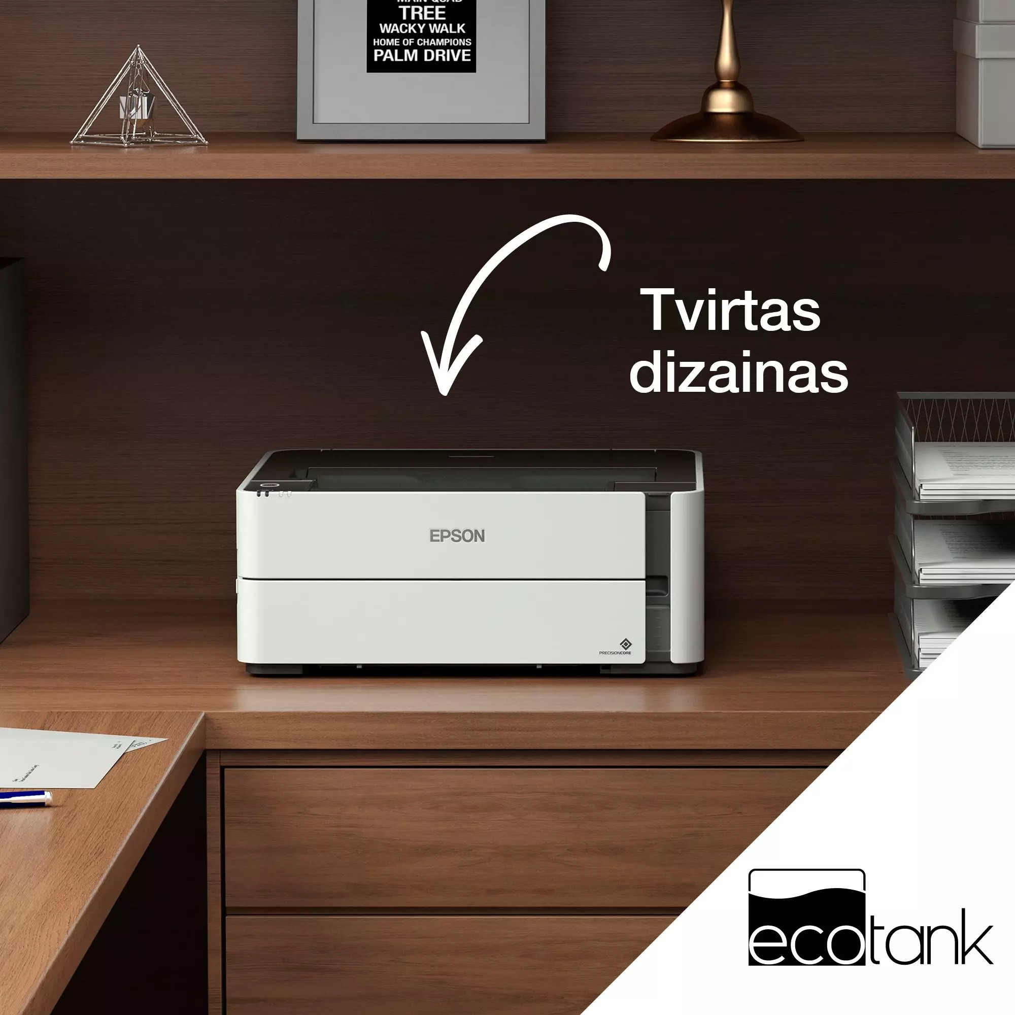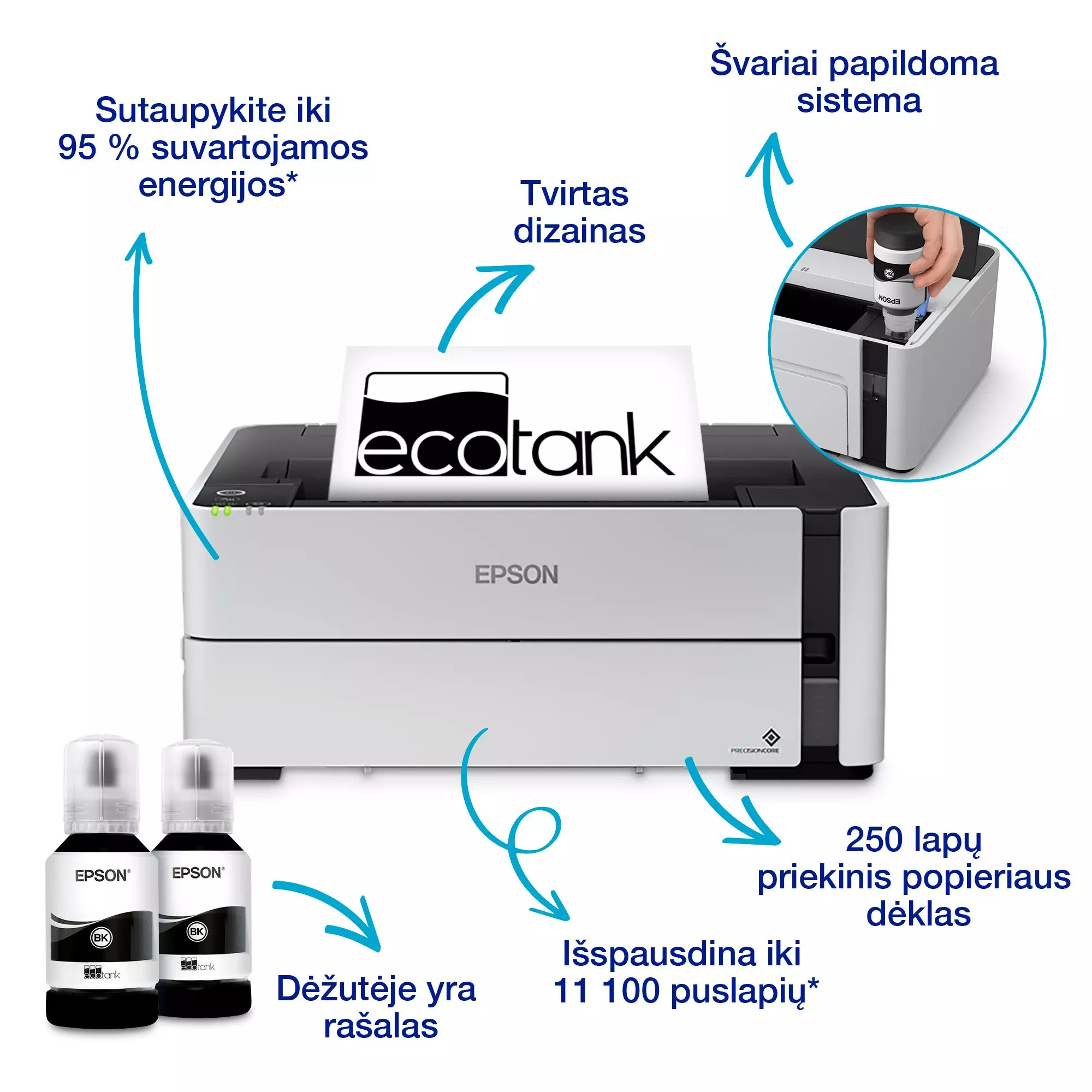 Epson EcoTank M1170 — это монохромный принтер с многоразовым резервуаром для чернил, который значительно снижает затраты на печать. С комплектными черными чернилами можно напечатать до 11 000 страниц, что делает его идеальным для больших объемов документов. Принтер поддерживает Wi-Fi, мобильную печать, автоматическую двустороннюю печать и имеет лоток на 250 листов. Печатающая головка PrecisionCore и технология Heat-Free обеспечивают быструю работу без времени на прогрев и эффективное энергопотребление.